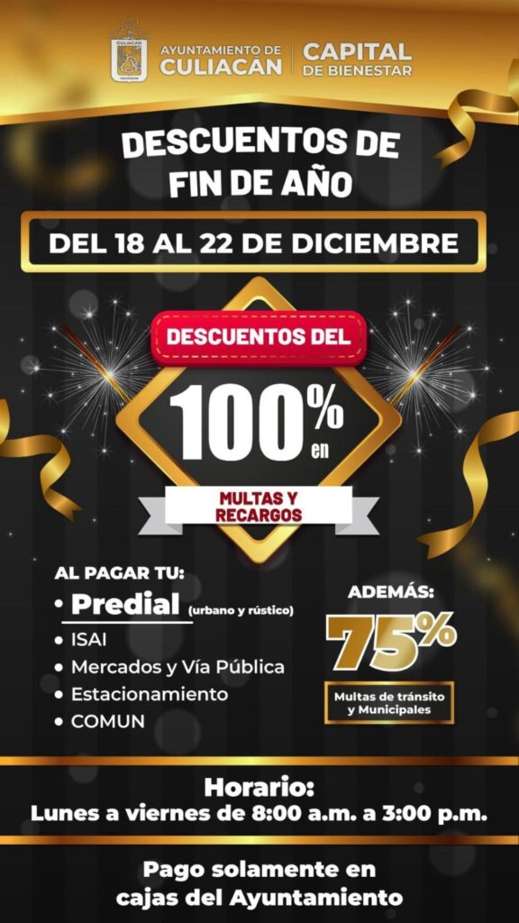 Thank you for reading this post, don't forget to subscribe!Desde el 18 hasta el 22 de diciembre, los ciudadanos podrán beneficiarse de descuentos del 100% en multas y recargos al pagar el Impuesto Predial. Además, se ofrecen descuentos del 75% en multas de tránsito y municipales, así como en ISAI, Mercados y Vía Pública, Estacionamiento y COMUN.