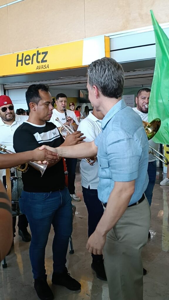 Culiacán, Sin.- Al son de banda fue recibido la tarde de este miércoles el Senador con licencia y «Corcholata» del Partido Verde Ecologista de México, Manuel Velasco coello, en el Aeropuerto Internacional de Culiacán, esto como parte de su recorridos por diferentes estados del país.