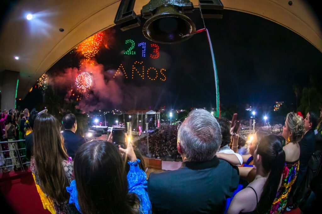 Como es tradición, en cuanto terminó el repicar de la campana, empezó el espectáculo de fuegos artificiales que iluminaron de varios colores y sonoros estallidos la oscuridad del cielo nocturno, lo cual es esperado cada año por los miles de asistentes a esta fiesta patria, pero lo que causó una grata sorpresa fue un espectáculo simultáneo de drones, que a gran altura del suelo, crearon coloridas figuras con motivo patrios, empezando por la bandera de México, una gigantesca campana, el escudo nacional, la figura del territorio nacional y de Sinaloa en particular, una silueta de un venado, trompetas, y las palabras Viva México, y Viva Sinaloa.